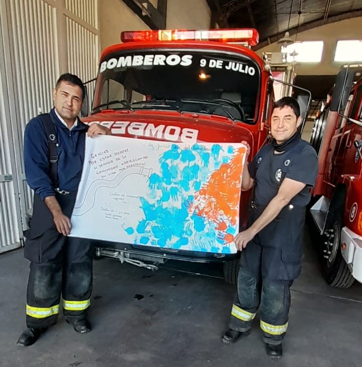 Niñas y niños del Centro de Desarrollo Infantil, dependiente de la secretaría de Desarrollo Comunitario de la Municipalidad de Nueve de Julio, visitaron el cuartel de Bomberos Voluntarios de 9 de Julio, entregaron trabajos realizados junto a docentes y familias, recorrieron las instalaciones y charlaron con los bomberos Juan Pedalino y Fabian Meynet.