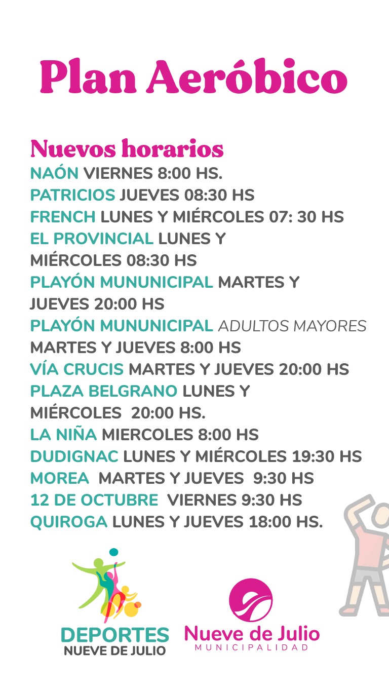 La Dirección de Deportes de la Municipalidad de Nueve de Julio informa los nuevos horarios para el plan aeróbico verano 2023/2024, en la ciudad cabecera y localidades del partido: