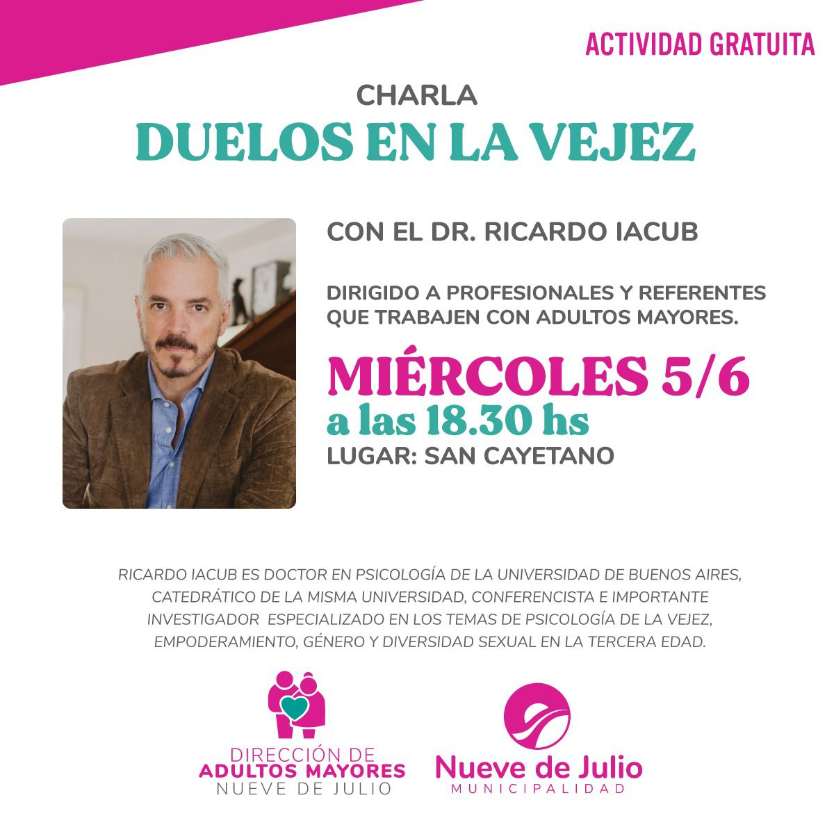 Asimismo, en tanto, a las 18,30 hs., Ricardo Iacub brindará una segunda charla para profesionales y referentes que trabajen con adultos mayores, en el mismo ámbito.
