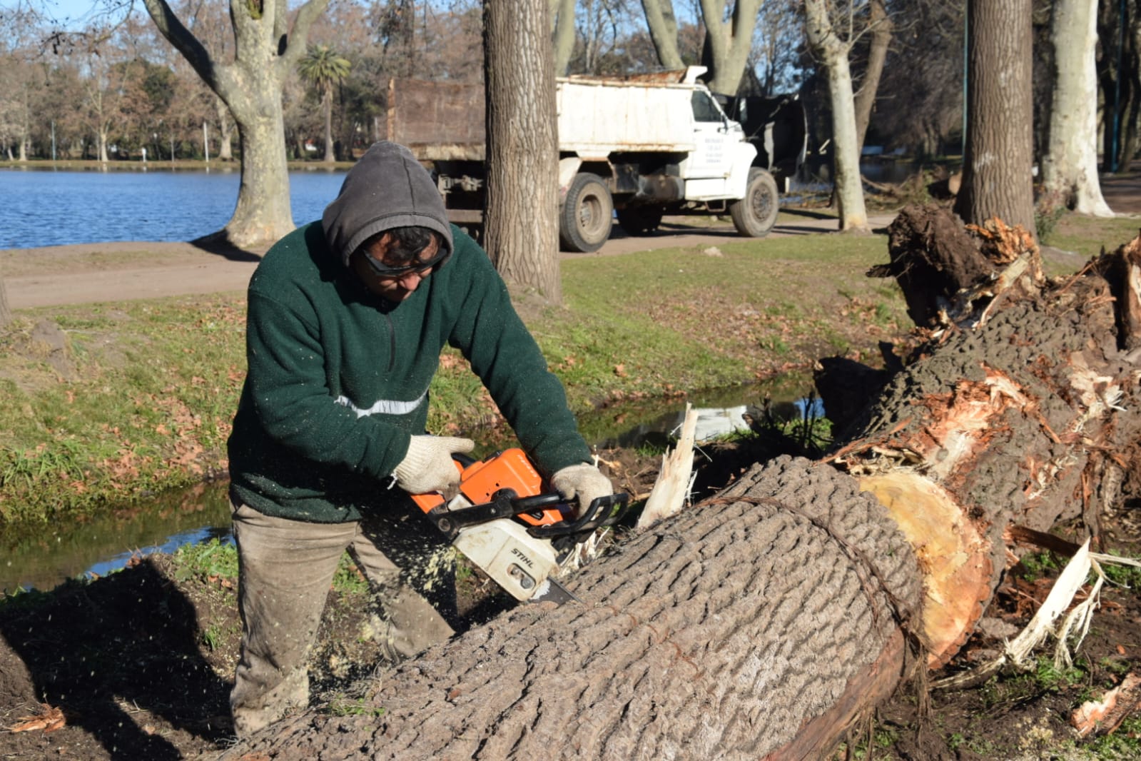 5/7/24. La Municipalidad de Nueve de Julio, a través de las áreas de Espacios Verdes y Vialidad Urbana se encuentra realizando trabajos de mantenimiento y limpieza en el Parque General San Martín, donde se ha procedido a la extracción de árboles añejos con peligro de caída y al trozado y retiro de aquellos que se encontraban derribados; completándose la tarea con la nivelación de los distintos espacios.