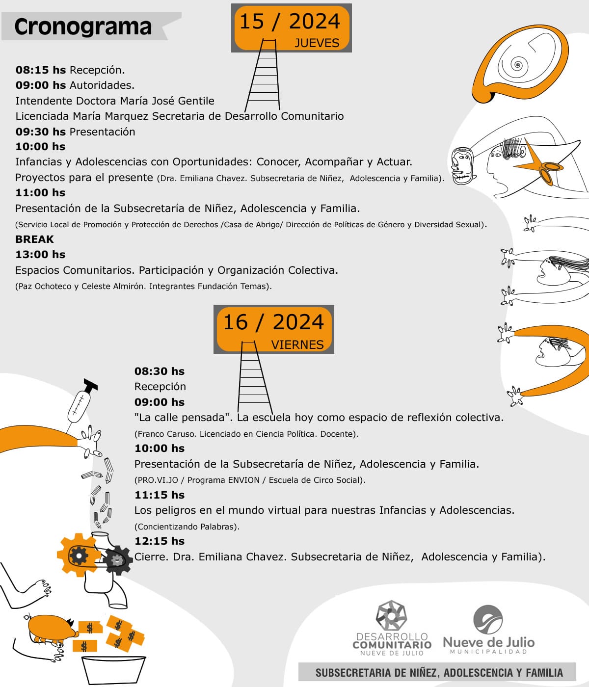 La Subsecretaría de Niñez, Adolescencia y Familia, dependiente de la Secretaría de Desarrollo Comunitario de la Municipalidad de Nueve de Julio, llevará adelante este jueves 15 y viernes 16 de agosto las Jornadas de Infancias y Adolescencias 2024 “Repensemos colectivamente desde sus voces”, las que tendrán como ámbito el Salón Blanco del Palacio Municipal y abarcarán un amplio programa, detallado a continuación: